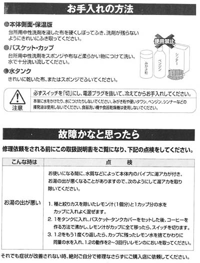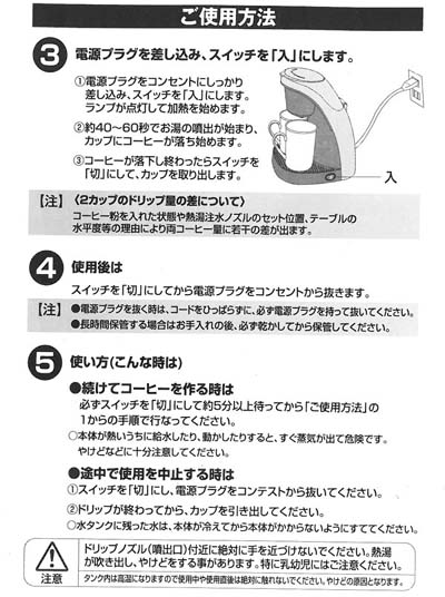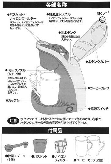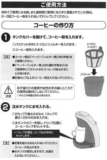 | 備考 | ■定格電源:100V 50/60Hz ■消費電力:450W ■タンク容量:約240ml(1〜2カップ) ■重量:約800g(カップ含む) ■コード長:約1m ■1カップ容量:約120ml ■付属品:計量スプーンx1・バスケットx1・ナイロンフィルターx1・コーヒーカップx2 ■保証期間:本体1年間 ■中国製 ■箱入り |